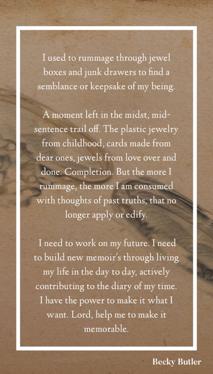 Once again her beauty shines. Once again her memory is revived. She is not forgotten. Once again she has purpose. There is value despite her brokenness. Just like us. Just like us.....beckybutler